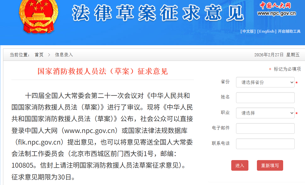 《中華人民共和國 消防救援人員法(草案)》已于2月27日公布,社會(huì)公眾可以直接登錄中國人大網(wǎng)或 法律法規(guī)數(shù)據(jù)庫提出意見,也可以將意見寄送全國人大常委會(huì)法制工作委員會(huì)(北京市西城區(qū)前門西大街1號,郵編:100805。信封上請注明 消防救援人員法草案征求意見)。